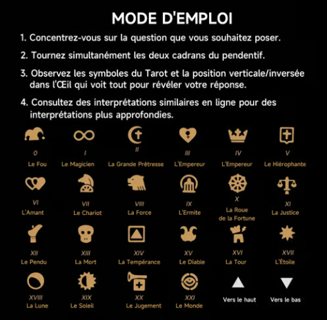 22 simboli degli Arcani Maggiori adornano l'anello esterno; il centro in ottone rispecchia le energie verticali/rovesciate. Il tuo mazzo di Tarocchi, condensato: saggezza a colpo d'occhio, sempre a portata di mano. 💫