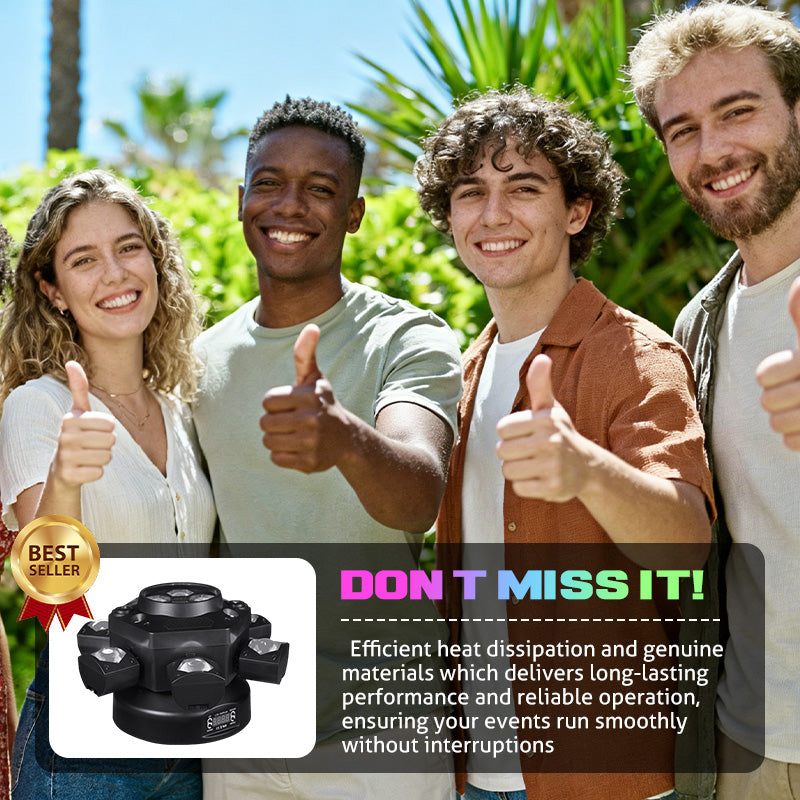 DESIGN DINAMICO A SEI BRACCIA – Dispone di sei bracci mobili indipendenti, ciascuno dei quali proietta un potente fascio luminoso. Ciò garantisce effetti mozzafiato che riempiono la stanza e spettacoli di luci energici che entusiasmano qualsiasi pubblico e sottolineano l'atmosfera del vostro evento.