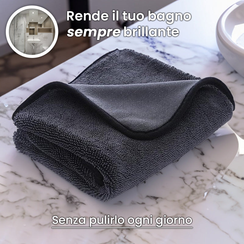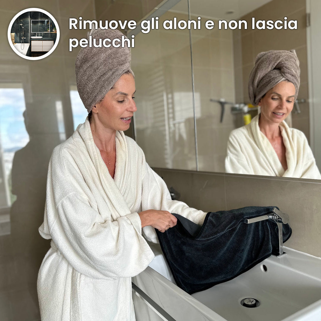 Grazie all'innovativa microfibra a triplo intrecciamento di cui è composto, il panno Glamere asciuga completamente la condensa e rimuove ogni traccia di calcare già presente.